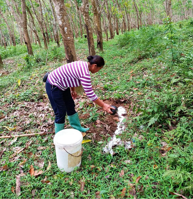 在胶园里,和韦芳想法相同的胶工不少。胶园里热火朝天,胶工们在做好疫情防控的基础上,手持胶刀细心割胶,满头是汗。林子里切割树皮的声音不时沙沙作响。